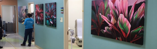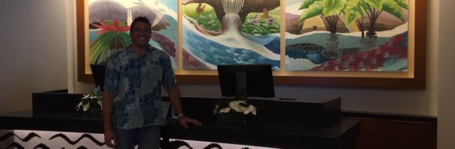 “Commissions have been a place where I can blend my personal understanding and love of Hawaiian history and bring this to the multitudes in public places. I have great pride to be involved with Kaiser Permanente Hospitals. Here I was able to bridge the world of Hawaiian medicine (organic and ethnic) to Western science. The bridge was built with art work. Once an Ohana, the family enters a floor to visit or be admitted, they are greeted with elements in artwork familiar to them. Hense a place of peace and ultimately healing and care is created in the envirement. Murals are a very effective means of communicating. Art has a way of speaking to you, no matter how many times you may view a mural; each time you may see something new.